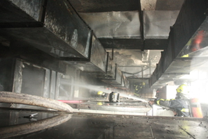 10時(shí)59分,北苑消防中隊(duì)作為第一力量到達(dá)火災(zāi)現(xiàn)場(chǎng)。經(jīng)過偵查后發(fā)現(xiàn)起火現(xiàn)場(chǎng)為四層鋼混結(jié)構(gòu)建筑,廠區(qū)內(nèi)呈回字形結(jié)構(gòu)共有3家企業(yè)以及一個(gè)副食品倉(cāng)庫(kù)。副食品倉(cāng)庫(kù)和偉靈電鍍廠在同一棟建筑內(nèi),毗鄰建筑為創(chuàng)美家具有限公司廠房。起火地點(diǎn)位于廠區(qū)右側(cè)3樓偉靈電鍍廠車間,由于機(jī)器內(nèi)部含有大量油漆、瀝青等材料,火勢(shì)燃燒十分猛烈。根據(jù)現(xiàn)場(chǎng)情況,消防隊(duì)員立即展開滅火戰(zhàn)斗,現(xiàn)場(chǎng)指揮員立即下令把現(xiàn)場(chǎng)攻堅(jiān)組官兵分成兩個(gè)小組分別從兩側(cè)樓梯上樓內(nèi)攻,防止火勢(shì)向周邊蔓延。當(dāng)消防員來到3樓車間內(nèi)時(shí)發(fā)現(xiàn)車間里面的機(jī)器由多個(gè)封閉的鐵箱子組成。內(nèi)部油漆原料燃燒后冒出大量濃煙,溫度非常高。消防員進(jìn)入后難以接近起火點(diǎn)。經(jīng)過現(xiàn)場(chǎng)指揮員分析后決定先利用水槍對(duì)起火機(jī)器進(jìn)行冷卻,然后對(duì)機(jī)器箱體進(jìn)行破拆,最后出多支水槍打擊火勢(shì)。
