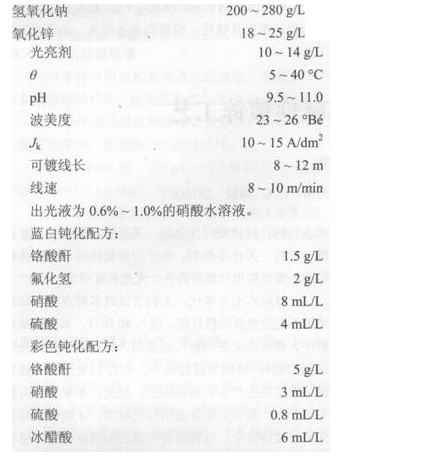 目前,鐵絲、鋼帶的鍍鋅仍較多采用硫酸鋅──硼酸型工藝。此工藝存在不少缺點,如:所用組合光亮劑對人體皮膚有較強的刺激作用,時常引起操作工皮膚過敏;電鍍過程中會產生大量膠狀油泥或沉淀于槽底,有時又漂浮于液面而粘附于鐵絲、鋼帶上,從而影響鍍鋅質量;因走速較快會使鍍液中的表面活性劑產生大量泡沫覆蓋于液面,影響工作環境,時常產生析氫的爆鳴;清洗廢水中含脂肪醇聚氧乙烯醚和苯亞甲基丙酮,其COD值很難達到排放標準的要求。而堿性鍍鋅光亮劑為水基型,不含高分子表面活性劑,廢水處理簡便。