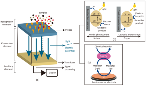 圖1. 半導(dǎo)體生物傳感器原理示意圖。(a)半導(dǎo)體生物傳感器工作流程圖。傳感部分主要分為光學(xué)傳感和電化學(xué)傳感。(b)光學(xué)生物傳感器主要原理的示意圖。(c)電化學(xué)生物傳感器主要原理的示意圖。