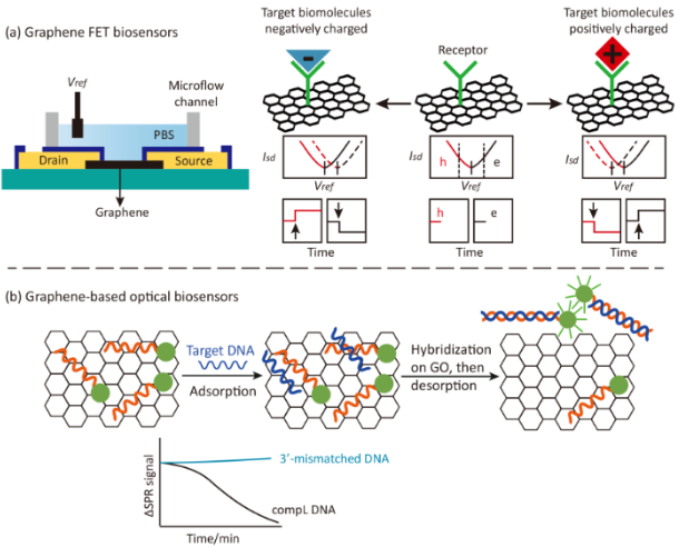 圖2. 石墨烯基半導(dǎo)體生物傳感器主要原理示意圖。(a)石墨烯FET生物傳感器的原理示意圖。(b)石墨烯光學(xué)生物傳感器的原理示意圖。