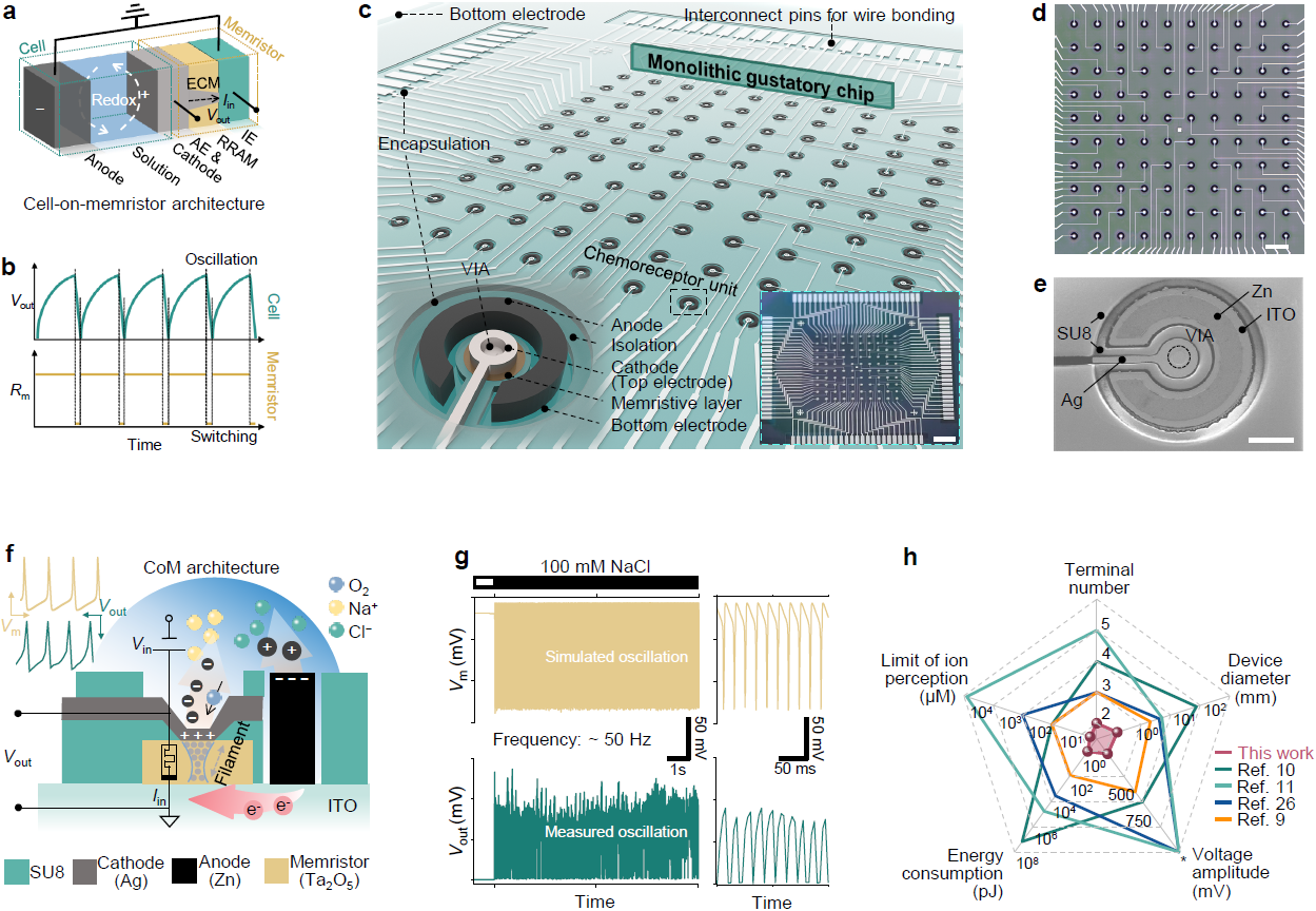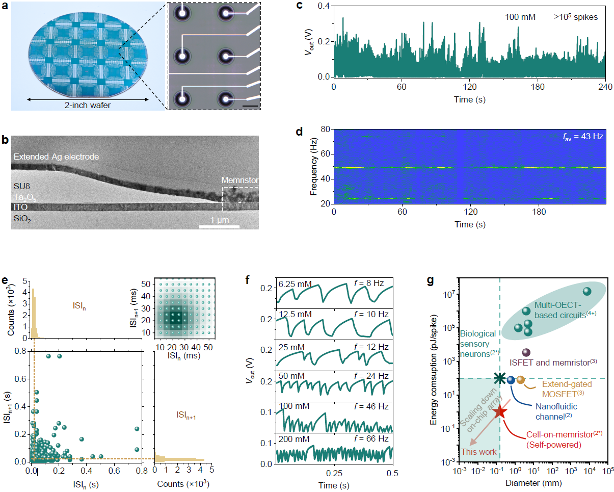 基于CMOS兼容制造工藝,實(shí)現(xiàn)了CoM器件的晶圓級(jí)陣列制備,演示了該領(lǐng)域中首個(gè)高密度化學(xué)感受器陣列系統(tǒng)。陣列中的單器件可以在鹽水溶液的離子刺激下,自發(fā)、原位地產(chǎn)生電壓振蕩信號(hào),其振蕩頻率與離子濃度直接相關(guān)。性能表征測(cè)試表明,陣列上的CoM器件表現(xiàn)出包括亞閾值振蕩、非周期性簇狀放電、全有或無尖峰脈沖以及隨機(jī)振蕩等高階神經(jīng)元?jiǎng)恿W(xué)行為。