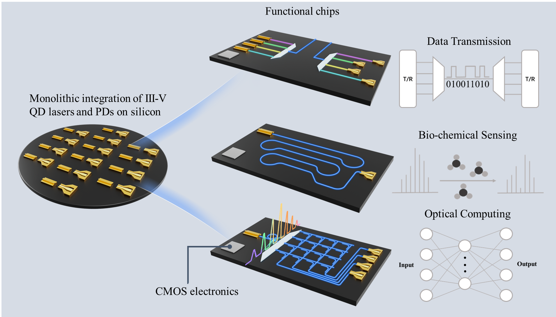 圖1 具備豐富功能的大規(guī)模硅基片上集成量子點(diǎn)光互聯(lián)系統(tǒng)