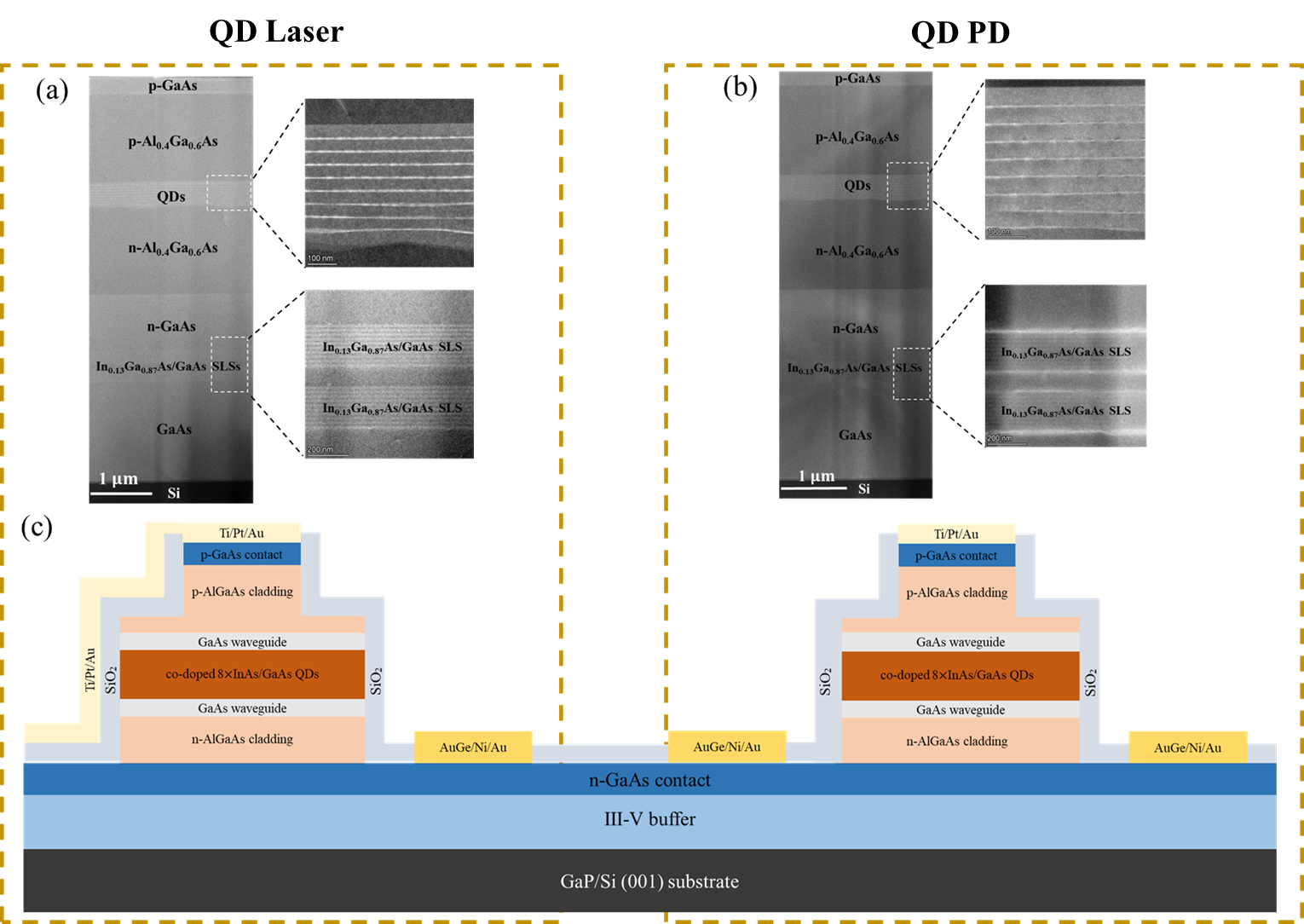 圖2 硅基片上集成量子點(diǎn)激光器與探測(cè)器互聯(lián)結(jié)構(gòu)示意圖
