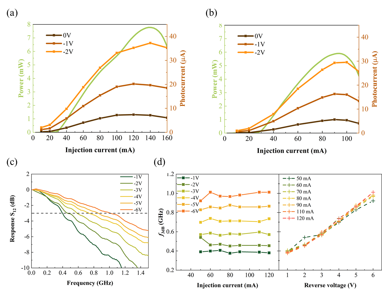 圖3 硅基光互連測(cè)試結(jié)果。激光器的輸出曲線及探測(cè)器響應(yīng)到的光電流曲線,激光器尺寸分別為(a) 3×1000 μm2和(b) 3×600 μm2。(c) 激光器注入電流為 80 mA時(shí),探測(cè)器在不同負(fù)偏壓下的頻率響應(yīng)。(d) 在不同的激光器注入電流和探測(cè)器偏壓條件下,硅基光互連系統(tǒng)的3-dB帶寬測(cè)試